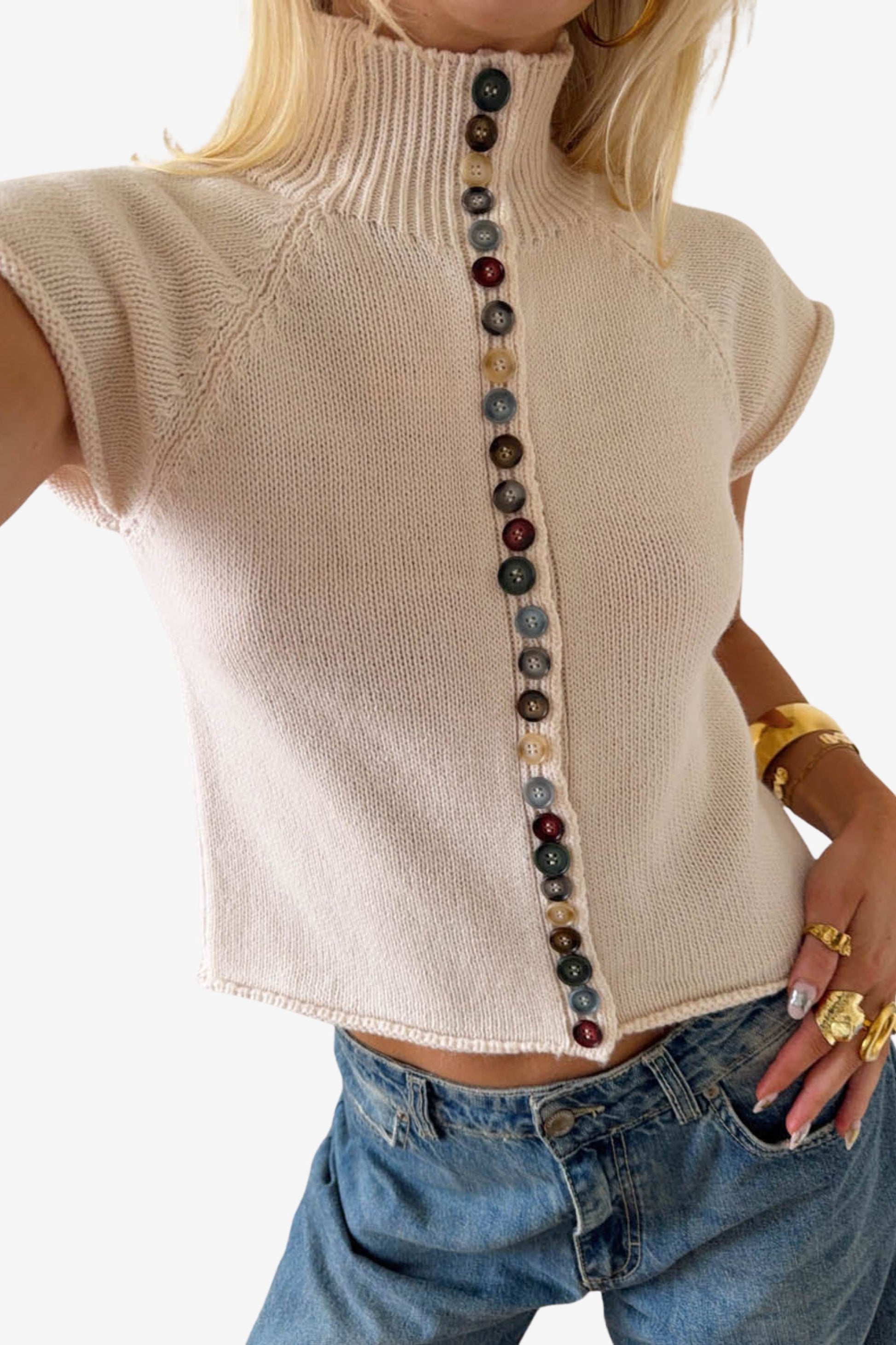 El diseño presenta mangas cortas y un cuello acanalado ligeramente alto, otorgándole un aspecto sofisticado y moderno. El cierre frontal con botones está decorado con pequeños botones multicolores que añaden un toque único y exclusivo. El corte es recto y relajado, lo que hace que el top sea cómodo de llevar durante todo el día.
