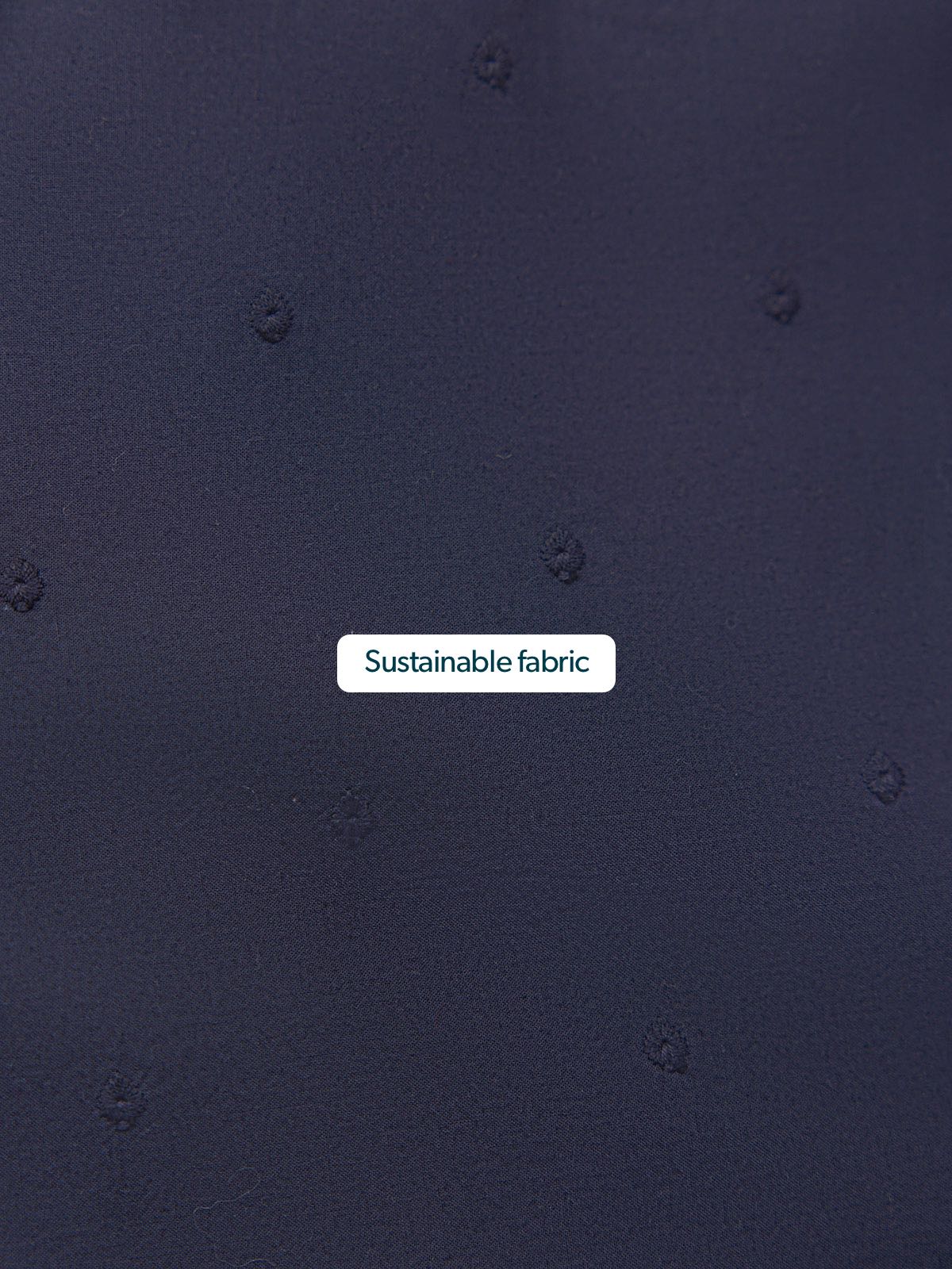 Nueva en esta colección es Luna, un impresionante vestido de popelín de algodón sostenible en azul marino oscuro con detalles de bordado y una falda de volantes. ¡Este estilo fue el más votado durante nuestro proceso de diseño con los clientes!